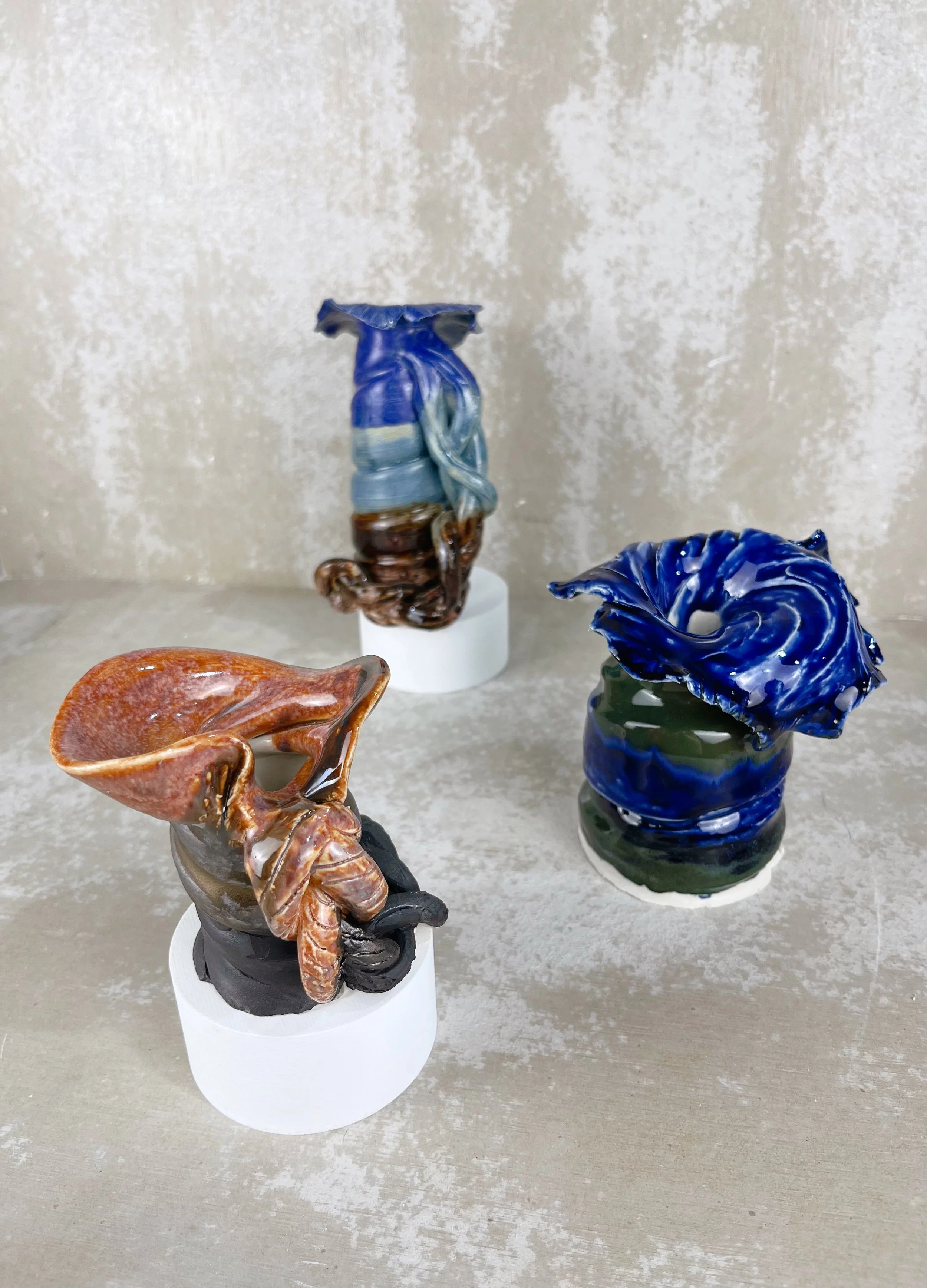 Wheel thrown using reclaimed clay and blue stained stoneware.